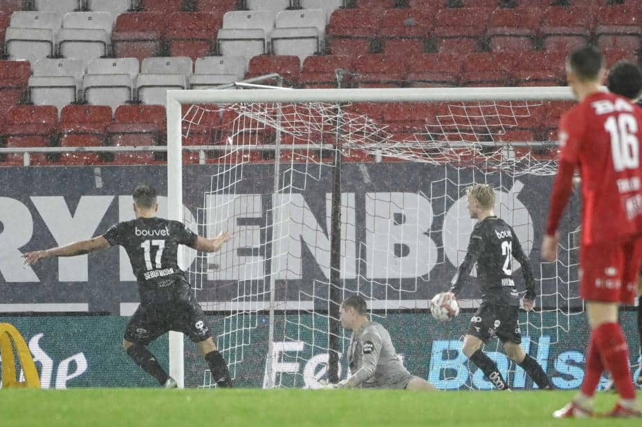 Og verre skulle det bli. Brann-keeper Grill skulle bare plukke et innlegg, men den våte ballen gled ut av hendene hans og falt til Sebulonsen, som pirket inn det første målet.