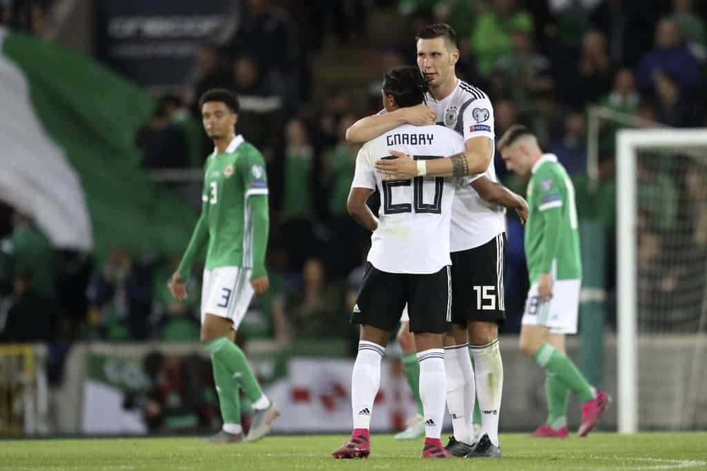 Tysklands Serge Gnabry og Niklas Suele da seieren var sikret mot Nord-Irland mandag. Foto: AP Photo/Peter Morrison/NTB scanpix.