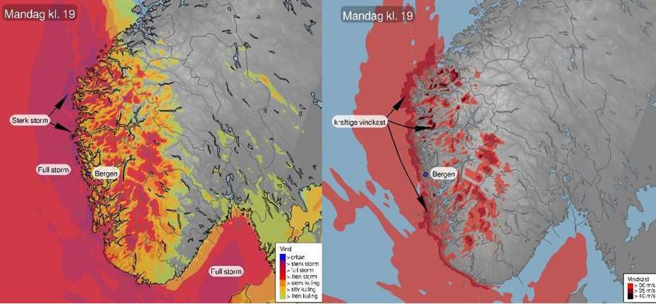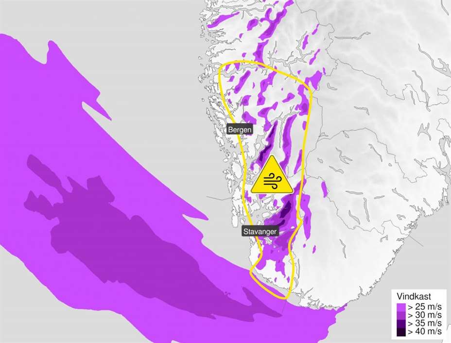 Vind over 32,6 meter per sekund regnes som orkan. Fredag ettermiddag er det ventet kraftige vindkast fra vest på omkring 27-35 m/s. Fredag kveld dreier vinden på nordvest.