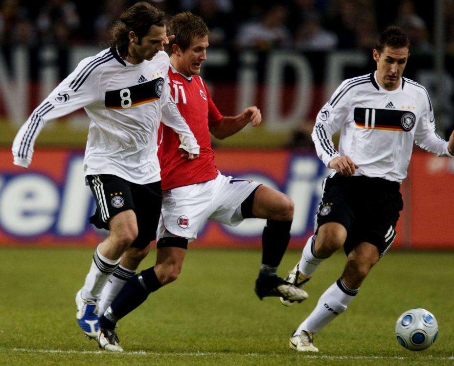 Miroslav Klose (t.h.), her i en landskamp mot Norge i 2009, blir hovedtrener i Altach. Foto: Cornelius Poppe / NTB