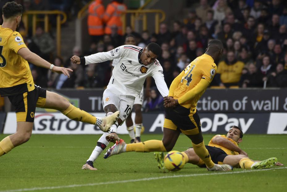 Marcus Rashford scorer Manchester Uniteds vinnermål mot Wolverhampton. Foto: Rui Vieira, AP / NTB