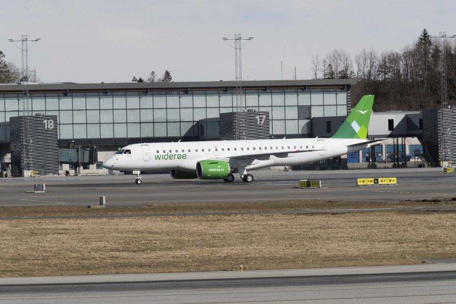 Ett av flyene som Widerøe har problemer med er det nye jetflyet Embraer 190 E-2, som selskapet har tre av. Foto: Terje Bendiksby / NTB