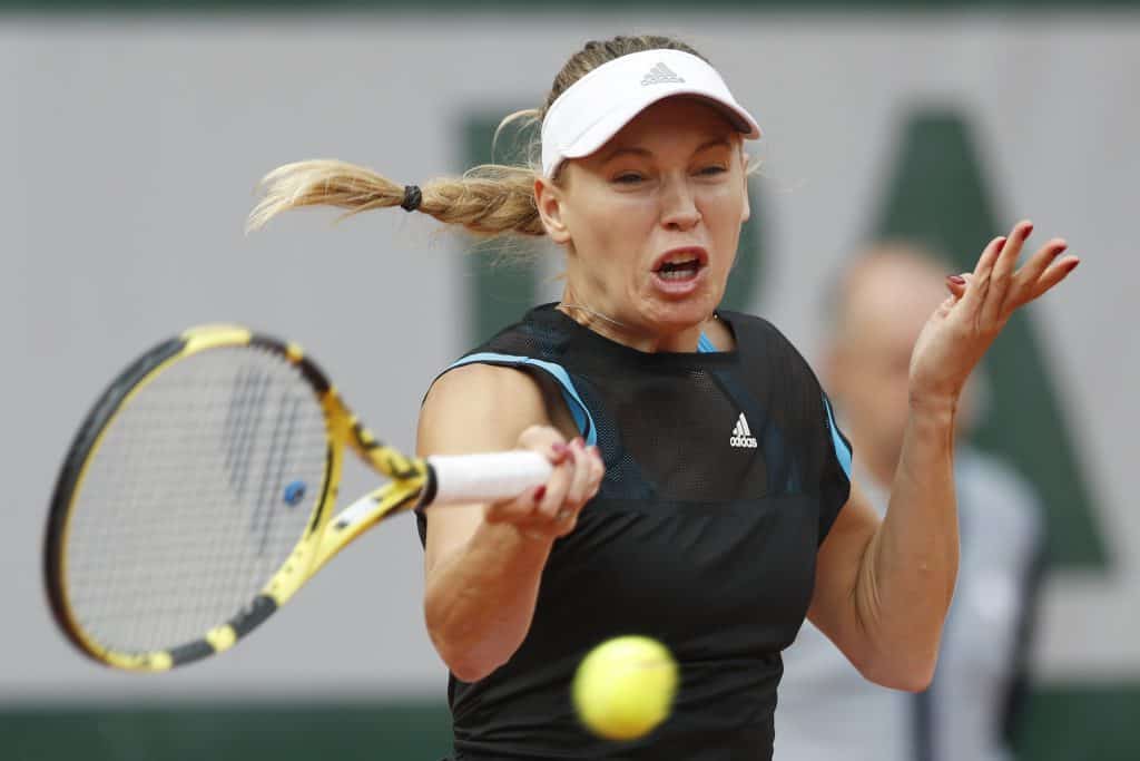 Caroline Wozniacki spiller i klær av gjenvunnet plast. Foto: Pavel Golovkin / AP / NTB scanpix