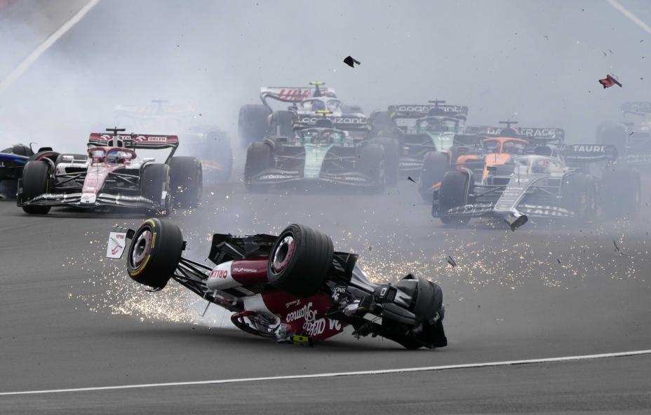 Zhou krasjet i første sving i Storbritannias Grand Prix. Det skjedde da George Russell først ble kjørt på bakfra av Pierre Gasly før han smalt inn i kineseren.