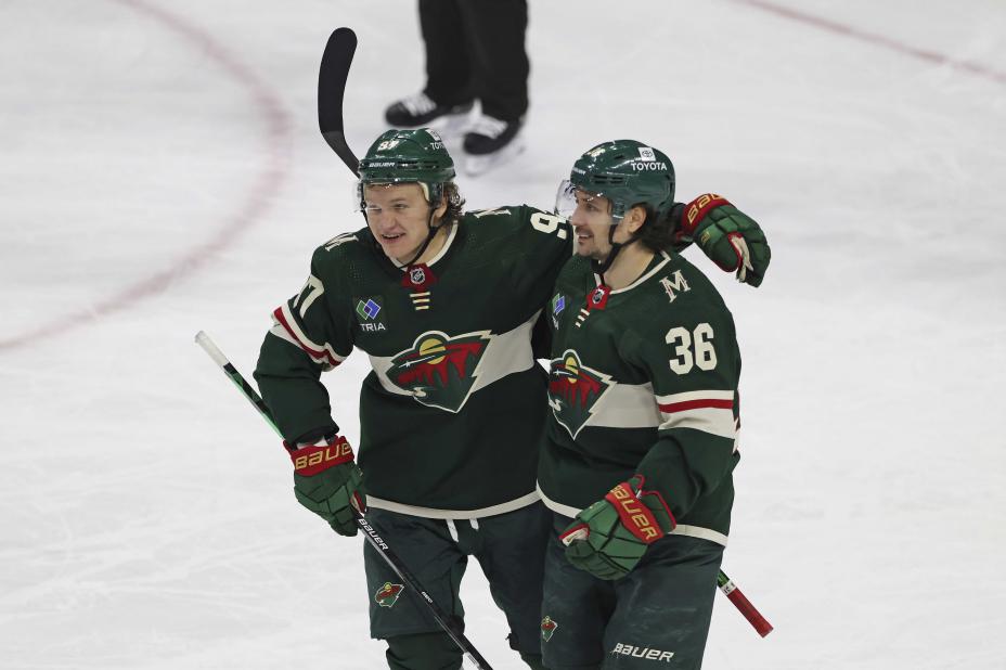 Mats Zuccarello (t.h.) feirer med Kirill Kaprizov i en Minnesota Wild-kamp før helgen. Foto: Stacy Bengs / AP / NTB
