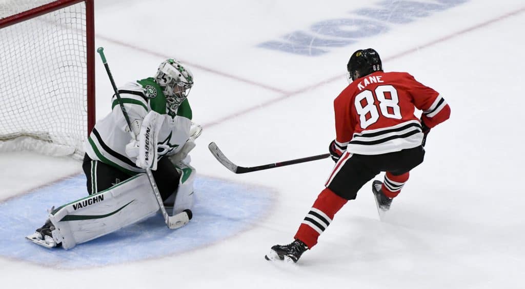 Laget lå under 0-5 fredag før Joel L’Esperance scoret trøstemålet i siste periode. Patrick Kane scoret to ganger for hjemmelaget og er oppe i 44 for sesongen.