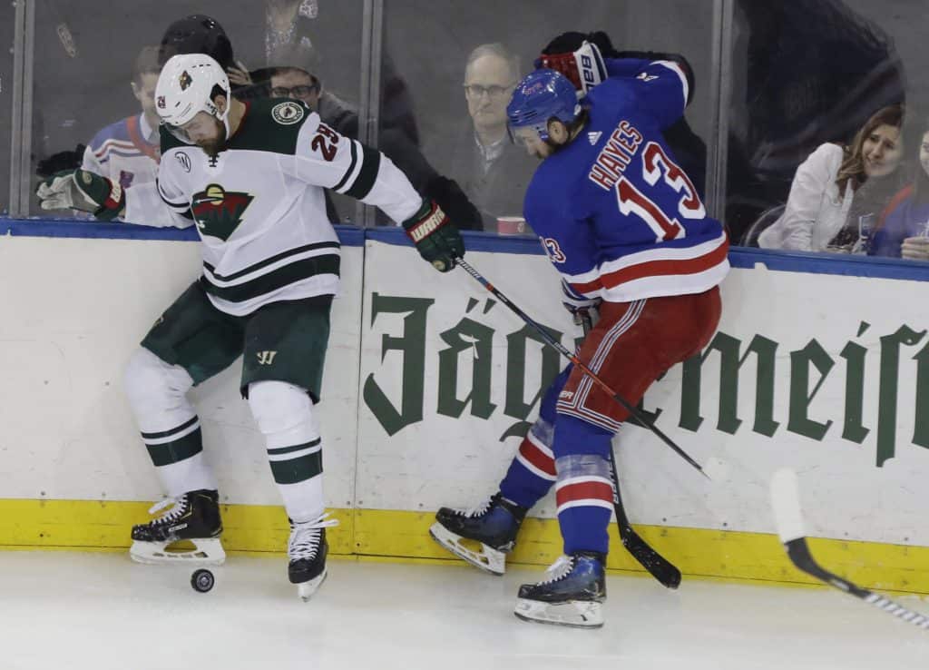 Minnesotas Greg Peteryn og Rangers' Hayes i duell under torsdagens NHL-kamp. Foto: Frank Franklin II / AP / NTB scanpix