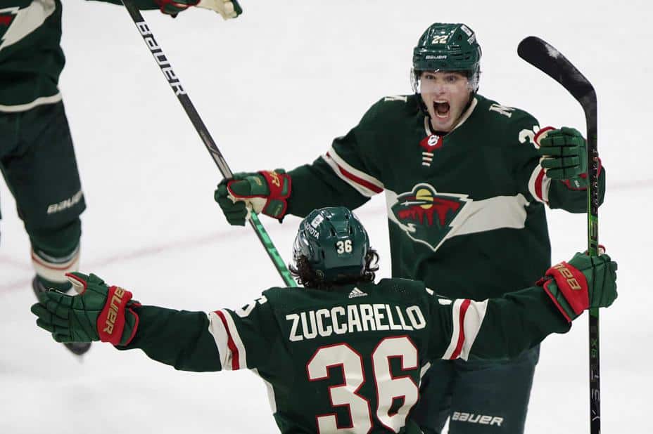 Mats Zuccarello jubler med lagkamerat Kevin Fiala etter å ha scoret 2-2-målet mot Washington Capitals. Foto: Andy Clayton-King / AP / NTB