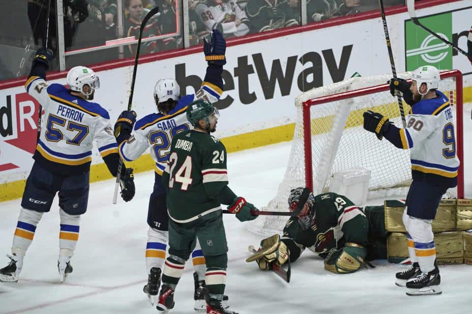 David Perron (57, til venstre) sto for tre av de fire målene til St. Louis mot Minnesota natt til tirsdag. Foto: Jim Mone / AP / NTB